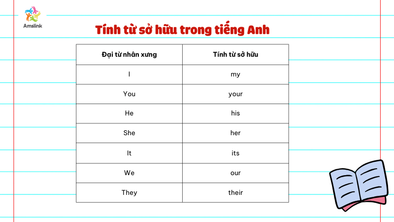 Ngoài đại từ nhân xưng, trong chương trình tiếng Anh lớp 3 các con còn được làm quen với tính từ sở hữu. Đây là những từ dùng để chỉ “của ai”, thường đứng trước danh từ.