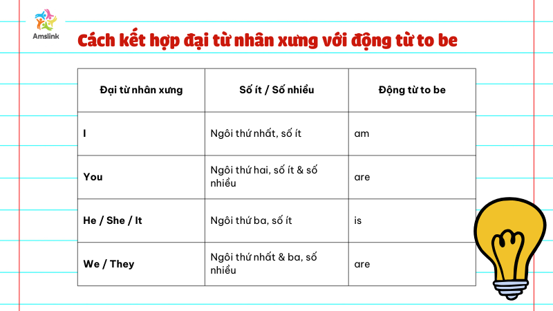 Trong tiếng Anh, khi đặt câu, đại từ nhân xưng thường đi kèm với động từ to be (am, is, are). Mỗi đại từ sẽ đi với một dạng to be khác nhau: