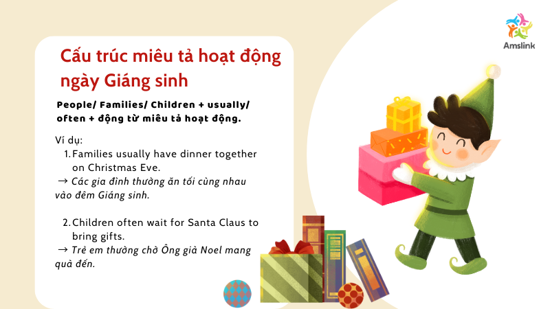 Cách dùng: Cấu trúc này giúp con nêu các hoạt động phổ biến và quen thuộc trong ngày Giáng sinh.