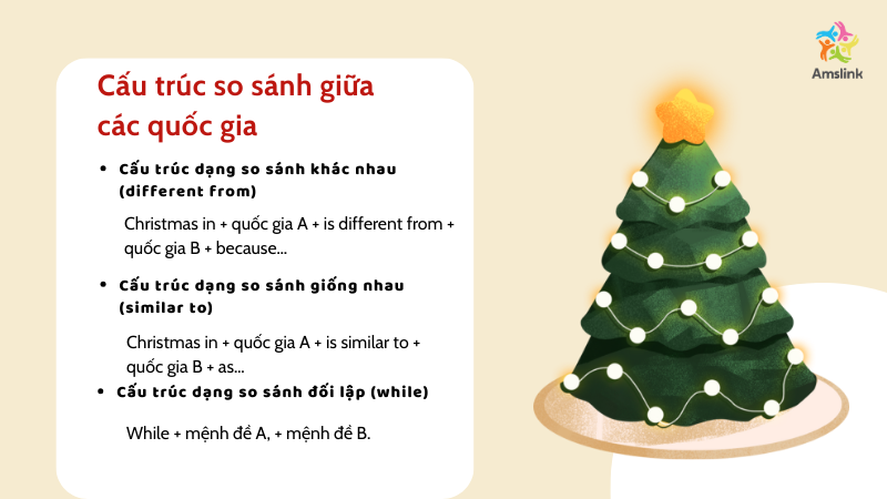 Cách dùng: Dùng để so sánh sự khác biệt về truyền thống, thời tiết hoặc cách tổ chức Giáng sinh giữa các nước.